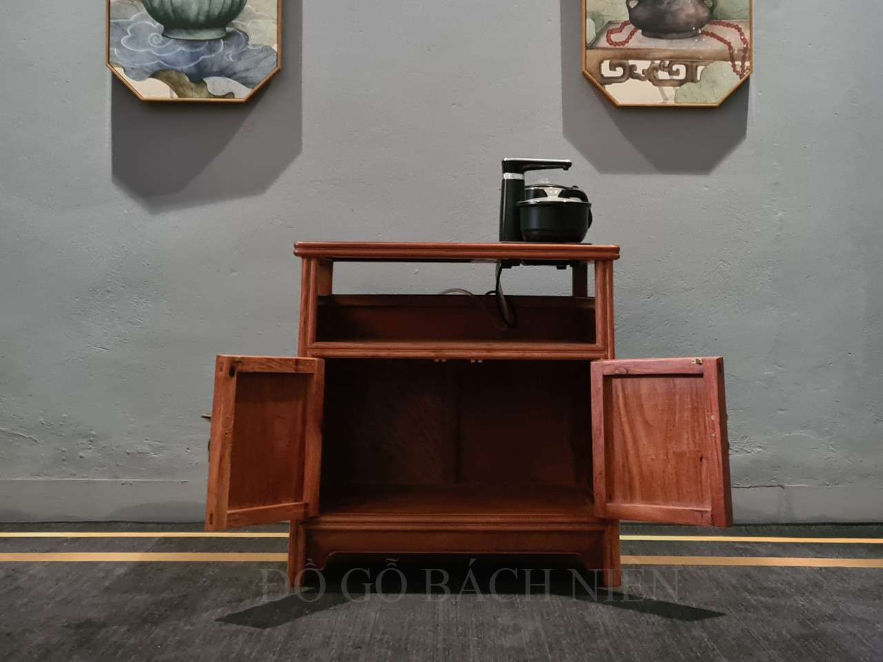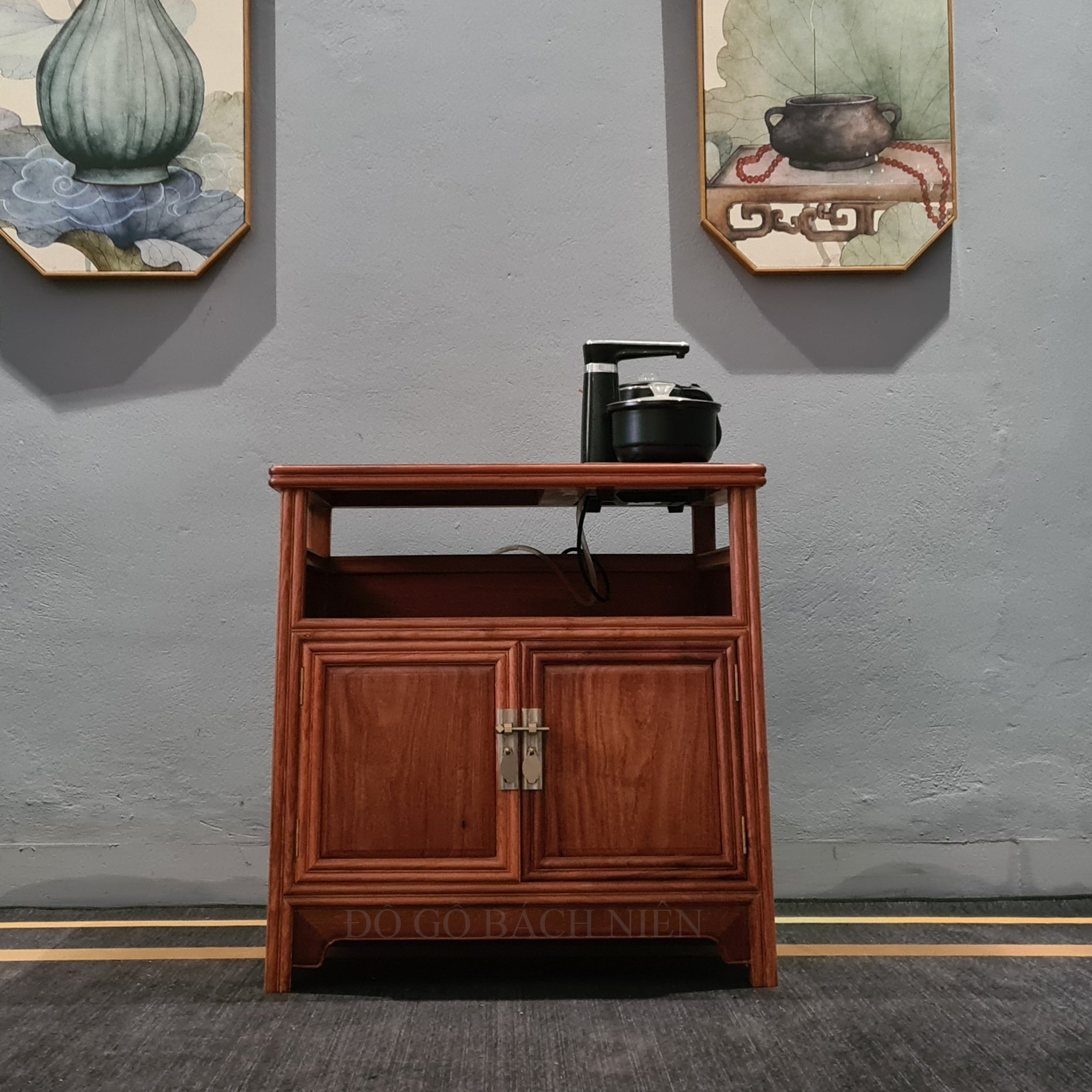 Kệ đun có dạng tủ hai cánh và 1 ngăn . Ý nghĩa rất rõ ràng, vật liệu thì quý giá, có thể nói “tự nhiên là siêu phàm, chế tác tỷ mỉ, tinh sảo”.